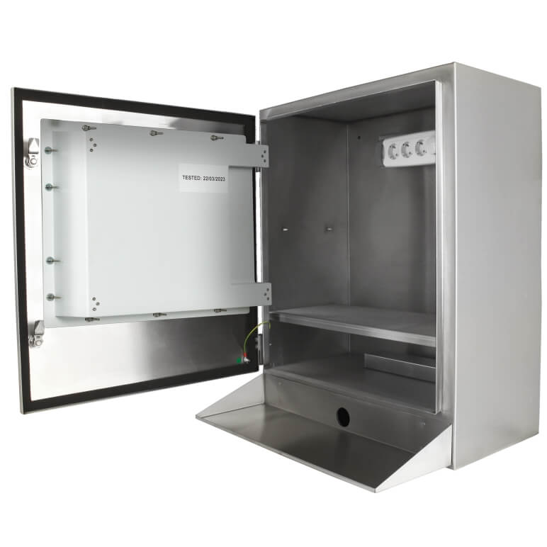 Waterafstotende Afdichtingen | Standaard aangebracht op de deur, sloten en ruit om te voorkomen dat vocht binnendringt en schade veroorzaakt aan de ingesloten apparatuur. Maakt zowel lichte als intensieve reiniging van de behuizing mogelijk. |