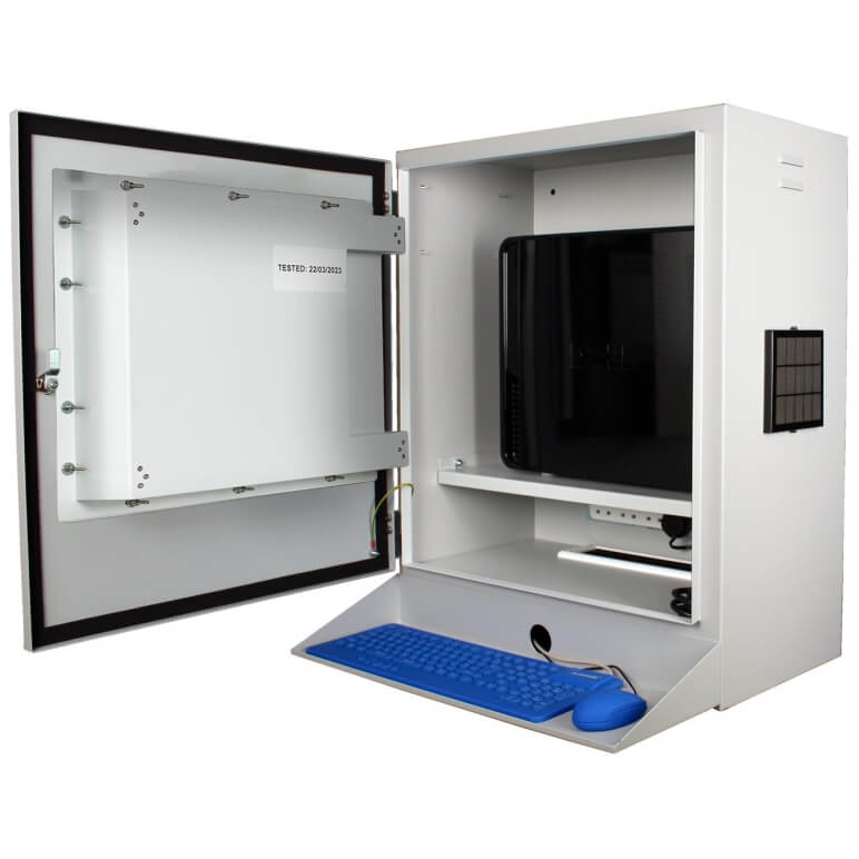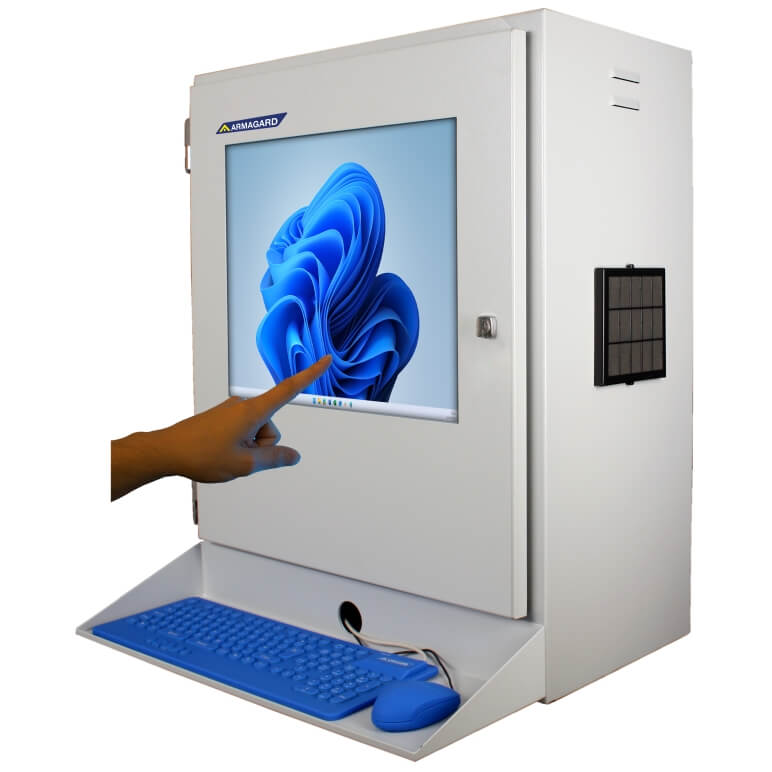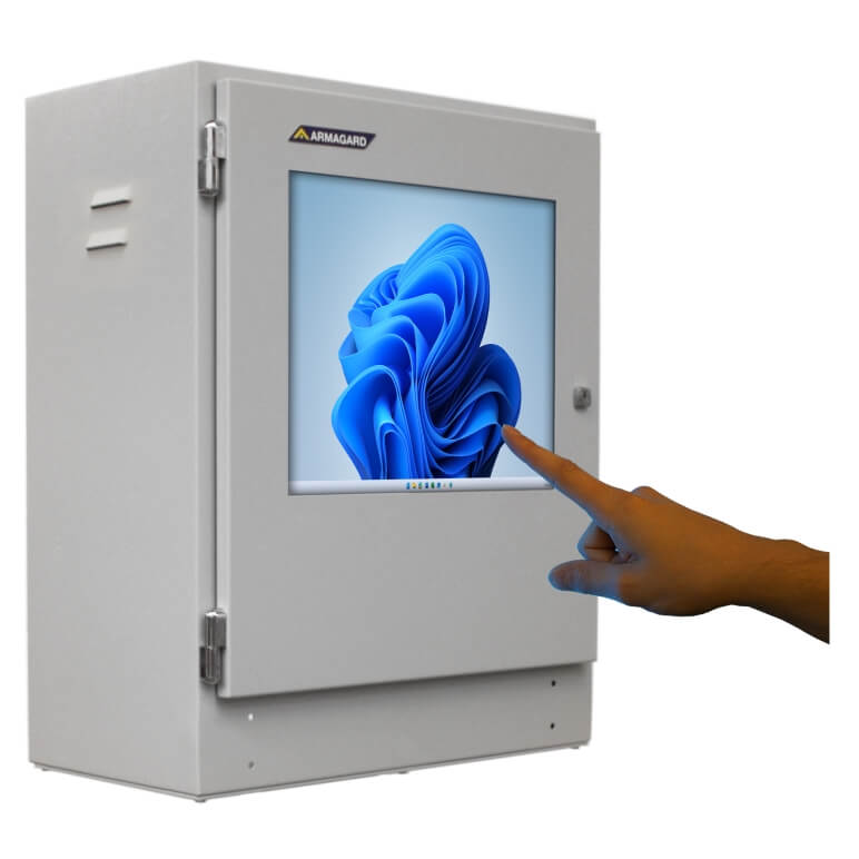 De robuuste touch-PC voor de industrie PENC-750 is afgedicht volgens IP54 en vervaardigd uit gepoedercoat zacht staal. Hij wordt gebruikt door toonaangevende industriële en productiebedrijven in heel Europa. Dankzij de stofdichte constructie biedt de 750-serie uitstekende bescherming in industriële, fabrieks- of veeleisende omgevingen. De behuizing kan aan de wand worden gemonteerd of op een Armagard-standaard worden geplaatst.