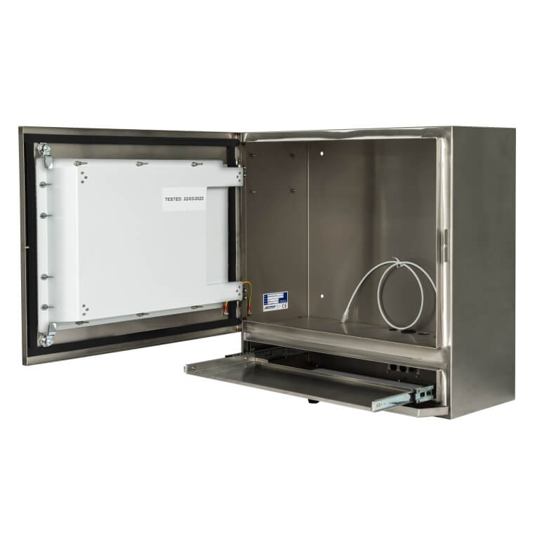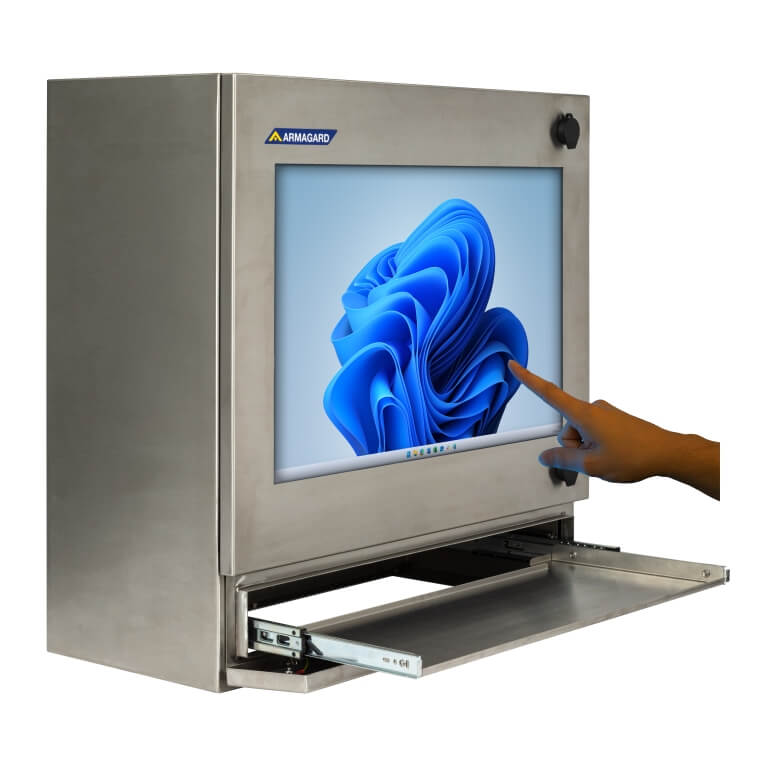 De SENC-550 biedt plaats aan een PC en touchscreen in RVS en creëert een IP65-geclassificeerd werkstation waarmee operators touch-gebaseerde software direct op de werkvloer kunnen gebruiken in hygiënische omgevingen.